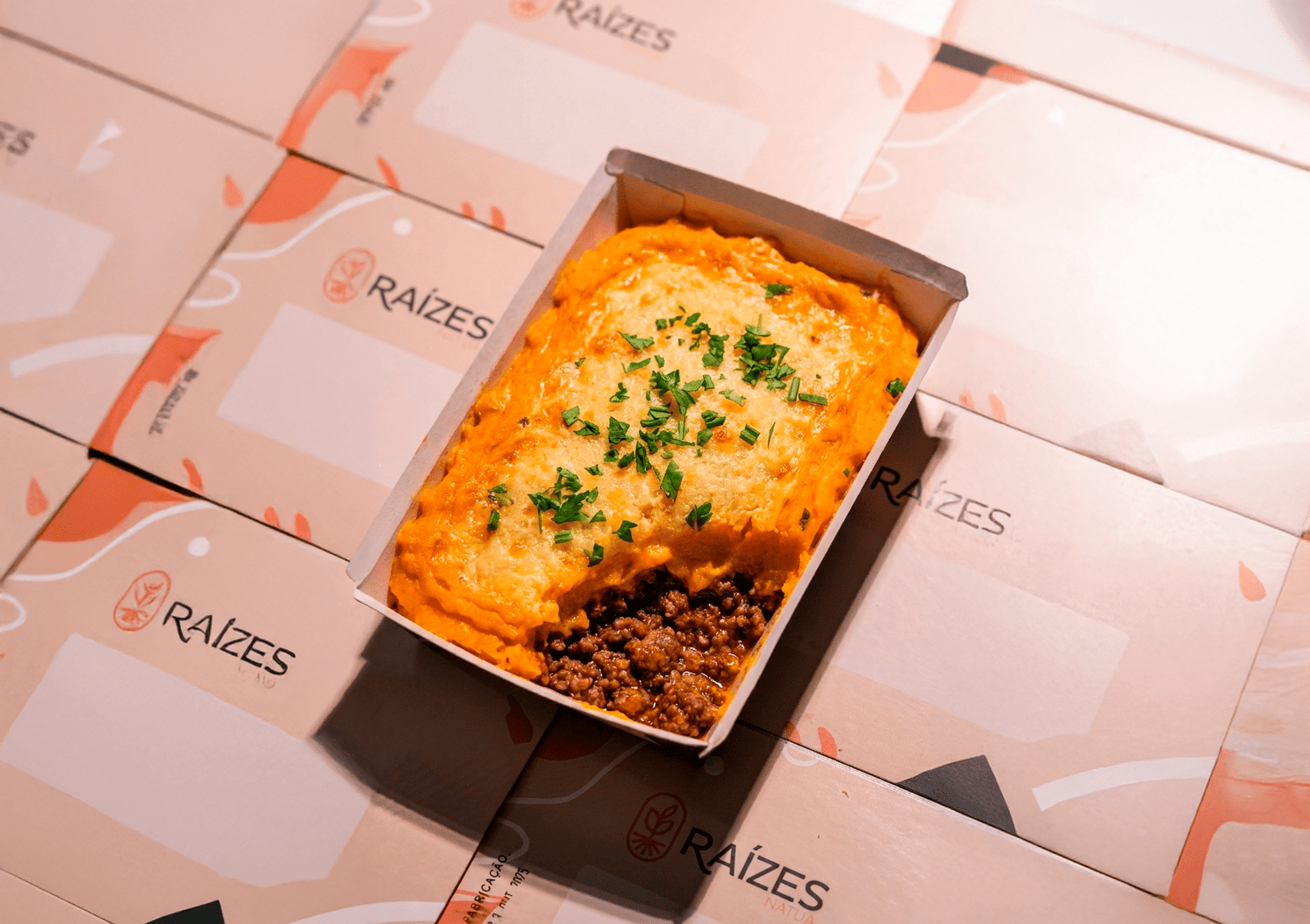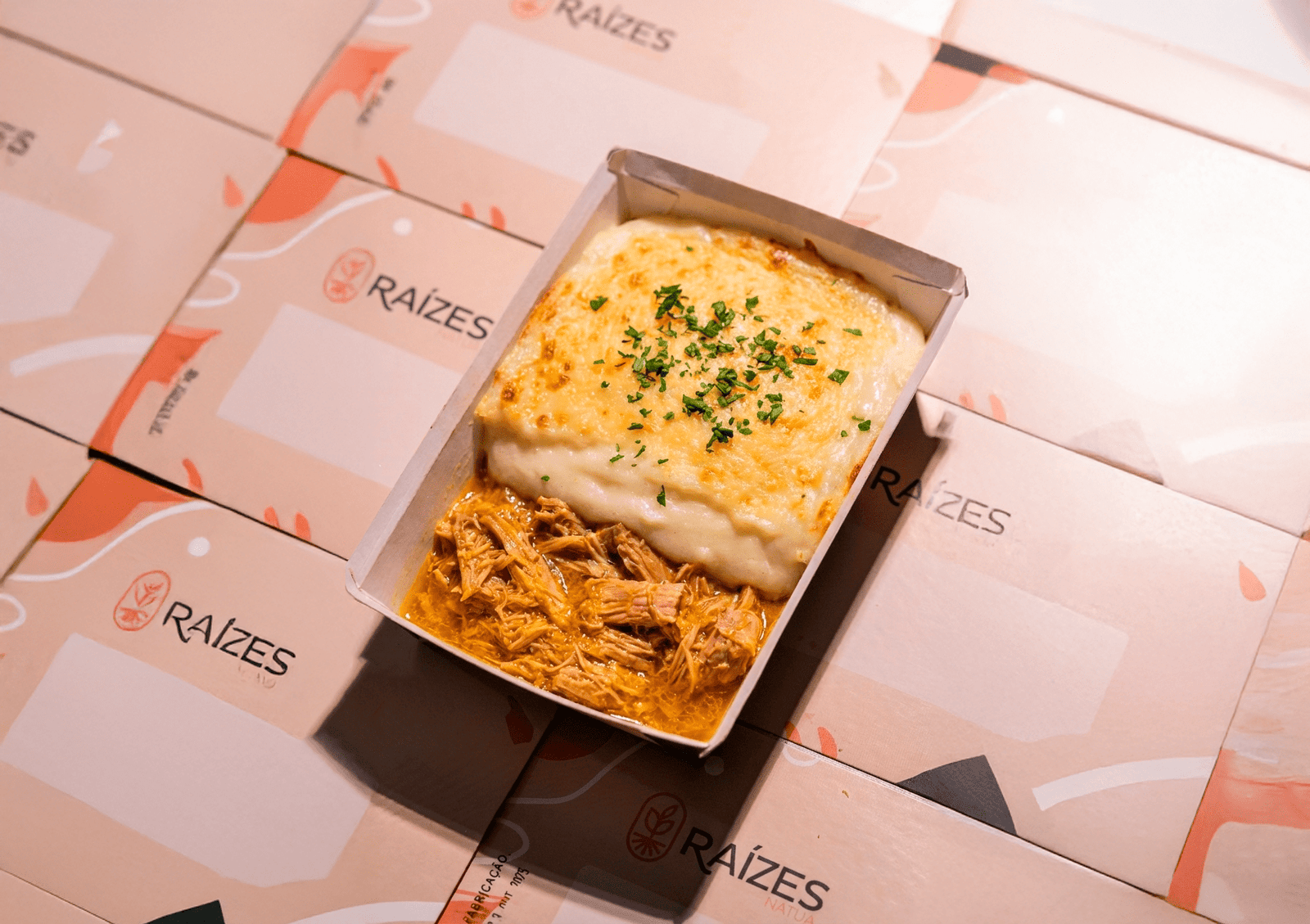 Lombo suíno macio, desfiado e envolvido num refogado aromático, com camada generosa de purê de mandioca bem lisinho. Finalizado no