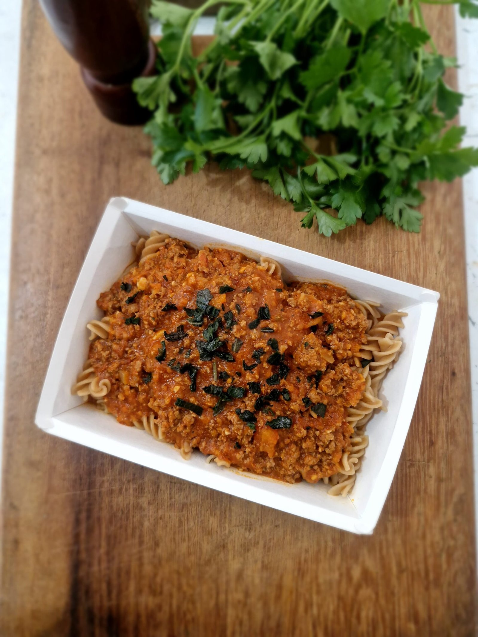Macarrão no ponto certo com bolonhesa encorpada e caseira, feita com molho de tomate fresco e finalizada com manjericão. Aroma